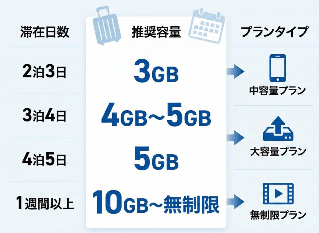 | 滞在日数 | 推奨容量(基準値) | プラン選びのポイント |