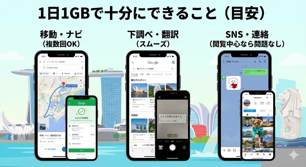 シンガポールは非常にデジタル化が進んだ都市国家であり、観光中は常にスマホをフル活用することになります。そのため、通信量は「滞在日数 × 1GB」をひとつの基準に考えるのが最適です。
